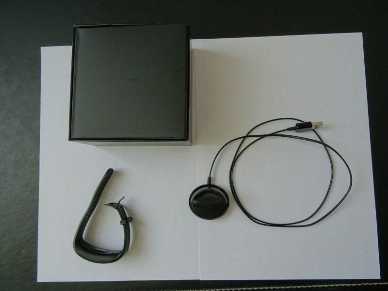Auf der Rückseite umgedreht, verfügt dieses tragbare Modell über die gleiche Hardware, einschließlich eines Herzfrequenzsensors und ein paar Pins zum Aufladen, wenn es auf dem mitgelieferten USB-Ladegerät liegt.